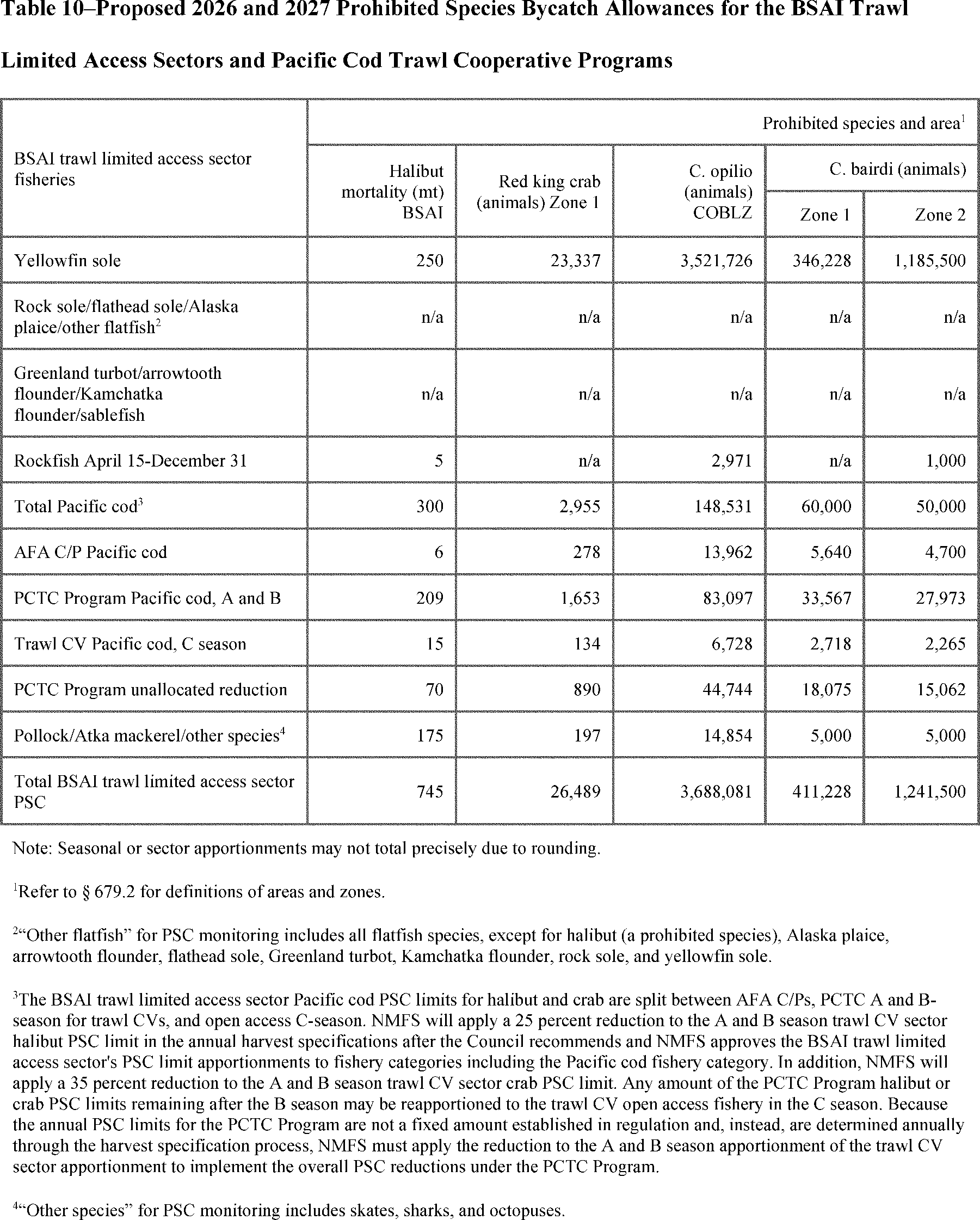 Section 679.21(e)(3)(i)(A)( 1 ) allocates 10.7 percent of each trawl gear PSC limit specified for crab as a PSQ reserve for use by the groundfish CDQ Program. Section 679.21(e)(3)(i)(A) requires that crab PSQ reserves be subtracted from the total trawl PSC limits. The crab and halibut PSC limits apportioned to the Amendment 80 and BSAI trawl limited access sectors are listed in table 35 to 50 CFR part 679. The resulting proposed 2026 and 2027 apportionments of crab and halibut PSC limits to CDQ PSQ, the Amendment 80 sector, and the BSAI trawl limited access sector are listed in table 8. Pursuant to §§ 679.21(b)(1)(i), 679.21(e)(3)(vi), and 679.91(d) through (f), crab and halibut trawl PSC limits apportioned to the Amendment 80 sector are then further assigned to Amendment 80 cooperatives as cooperative quotas. Crab and halibut PSC cooperative quotas assigned to Amendment 80 cooperatives are not allocated to specific fishery categories.