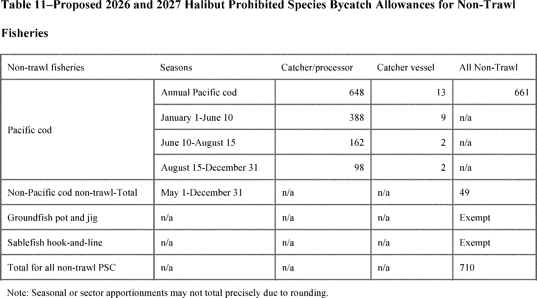 Sections 679.21(b)(1)(iii)(A) and (B) require apportionment of the BSAI non-trawl halibut PSC limit into PSC allowances among six fishery categories. Table 11 lists the proposed fishery PSC allowances for the non-trawl fisheries.