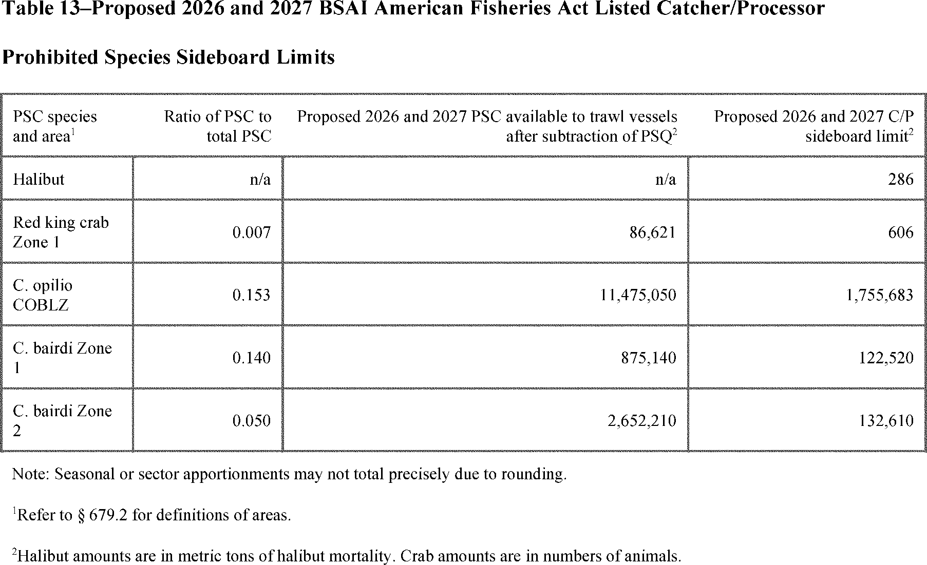 Section 679.64(a)(2) and tables 40 and 41 to 50 CFR part 679 establish a formula for calculating PSC sideboard limits for halibut and crab caught by listed AFA C/Ps. The basis for these sideboard limits is described in detail in the final rules implementing the major provisions of the AFA (67 FR 79692, December 30, 2002) and Amendment 80 (72 FR 52668, September 14, 2007). PSC species listed in table 13 that are caught by listed AFA C/Ps participating in any groundfish fishery other than pollock will accrue against the proposed 2026 and 2027 PSC sideboard limits for the listed AFA C/Ps. Sections 679.21(b)(4)(iii), (e)(3)(v), and (e)(7) authorize NMFS to close directed fishing for groundfish other than pollock for listed AFA C/Ps once a 2026 or 2027 PSC sideboard limit is reached. Pursuant to § 679.21(b)(1)(ii)(C) and (e)(3)(ii)(C), halibut or crab PSC by listed AFA C/Ps while fishing for pollock will accrue against the PSC allowances annually specified for the pollock/Atka mackerel/"other species" fishery categories, according to § 679.21(b)(1)(ii)(B) and (e)(3)(iv).