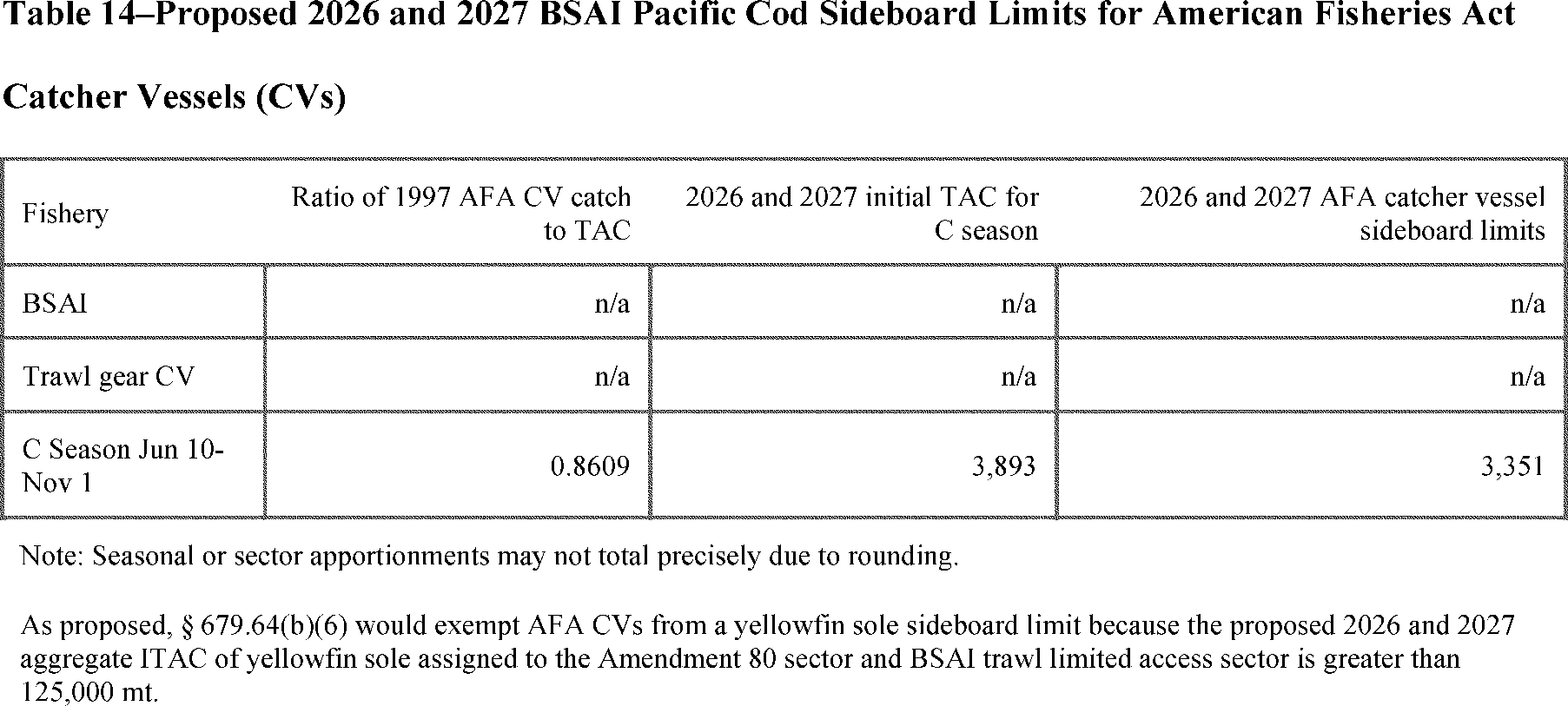 Section 679.20(d)(1)(iv)(D) and table 55 to 50 CFR part 679 prohibit non-exempt AFA CVs from directed fishing for a majority of the groundfish species or species groups subject to sideboard limits. The only remaining sideboard limit for non-exempt AFA CVs is for Pacific cod. Pursuant to amendment 122 to the FMP, the Pacific cod sideboard limit is no longer necessary in the A and B seasons because directed fishing in the BSAI for Pacific cod by trawl CVs is now managed under the PCTC Program, and accordingly the sideboard limit is in effect in the C season only (§ 679.64(b)(3)(ii)). Table 14 lists the proposed 2026 and 2027 AFA CV Pacific cod sideboard limits.