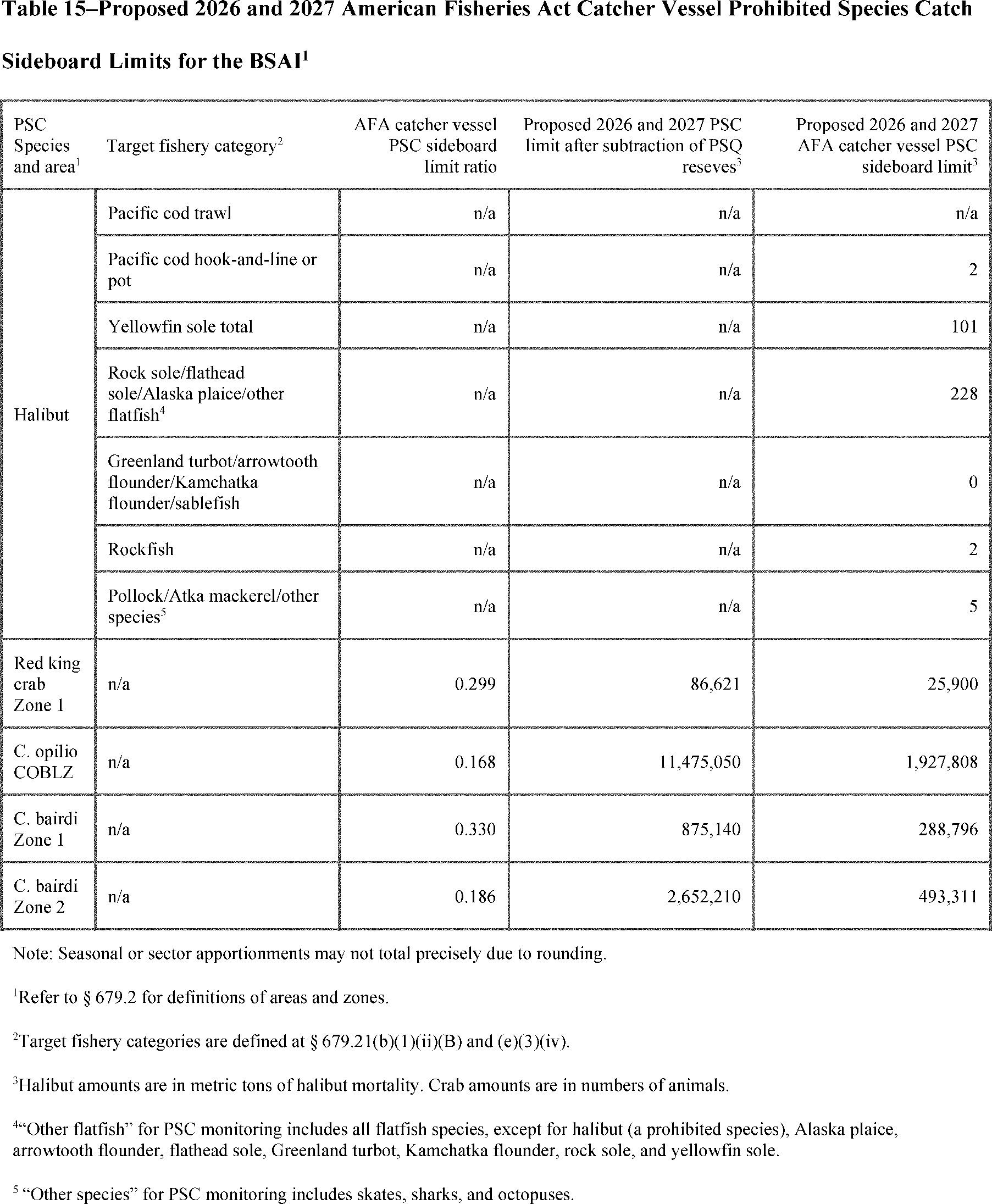 Halibut and crab PSC limits listed in table 15 that are caught by AFA CVs participating in any groundfish fishery other than pollock will accrue against the 2026 and 2027 PSC sideboard limits for the AFA CVs. Sections 679.21(b)(4)(iii), (e)(3)(v), and (e)(7) authorize NMFS to close directed fishing for groundfish other than pollock for AFA CVs once a 2026 or 2027 PSC sideboard limit is reached. Pursuant to § 679.21(b)(1)(ii)(C) and (e)(3)(ii)(C), halibut or crab PSC by AFA CVs while fishing for pollock will accrue against the PSC allowances annually specified for the pollock/Atka mackerel/"other species" fishery categories, according to § 679.21(b)(1)(ii)(B) and (e)(3)(iv).