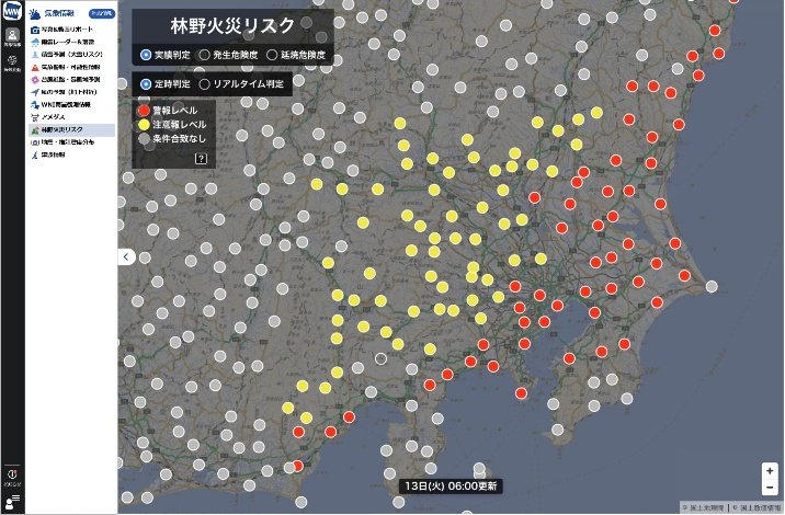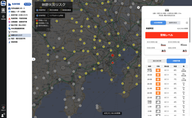 株式会社ウェザーニューズ(本社:千葉市美浜区、代表取締役社長:石橋 知博)は、法人向け気象情報「ウェザーニュース for business」の林野火災リスクサービスにおいて、今年1月から全国の自治体・消防組織で開始された「林野火災警報・注意報」の運用を支援する新機能として、総務省消防庁の指針に基づく「林野火災リスク判定」の提供を開始しました。本機能は、過去の降水量や気象台が発表する乾燥・強風の注意報をリアルタイムで自動解析し、林野火災のリスクを「警報レベル」「注意報レベル」「条件合致なし」の3 段階で即座に判定します。降水や警報の有無の管理を自動化することで変化の見逃しを防ぎ、自治体や消防組織の迅速かつ的確な警報・注意報の発令を支援します。