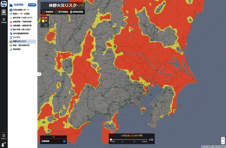 また、林野火災リスクでは1kmメッシュの高解像度な「発生危険度」と「延焼危険度」の予測も1時間ごとに最大72時間先まで閲覧できます。