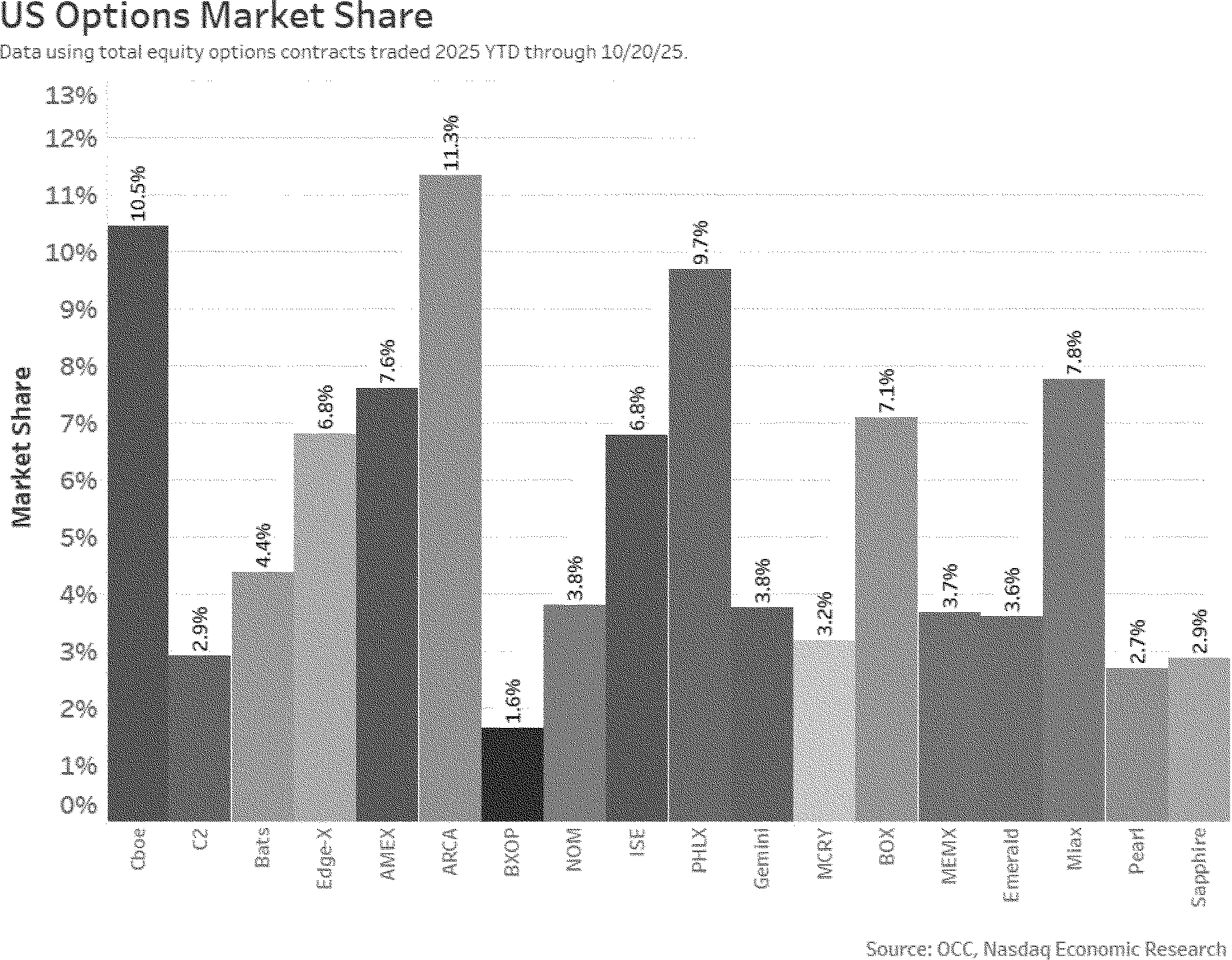 For the comparability analysis, the Exchange assessed market share (10) for each of the eighteen options markets based on total options contracts traded in 2025 through October 20, 2025, as set forth in the graph below.