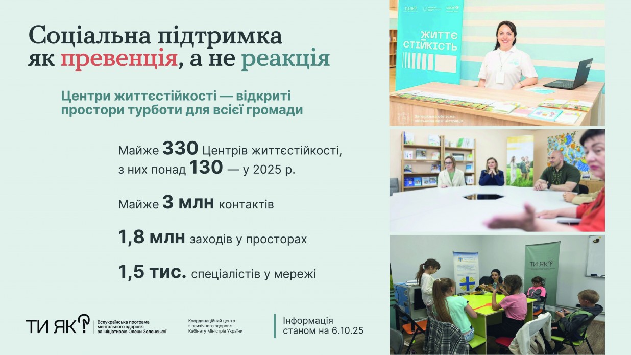 Ukraine has 326 resilience centers - barrier-free spaces where anyone can access psychosocial services, participate in group therapy sessions, and attend meetings. Over 300 communities across 24 regions and Kyiv are involved in the program, including 17 relocated communities from temporarily occupied territories. In total, resilience centers have hosted over 1.5 million activities for 2.5 million people.