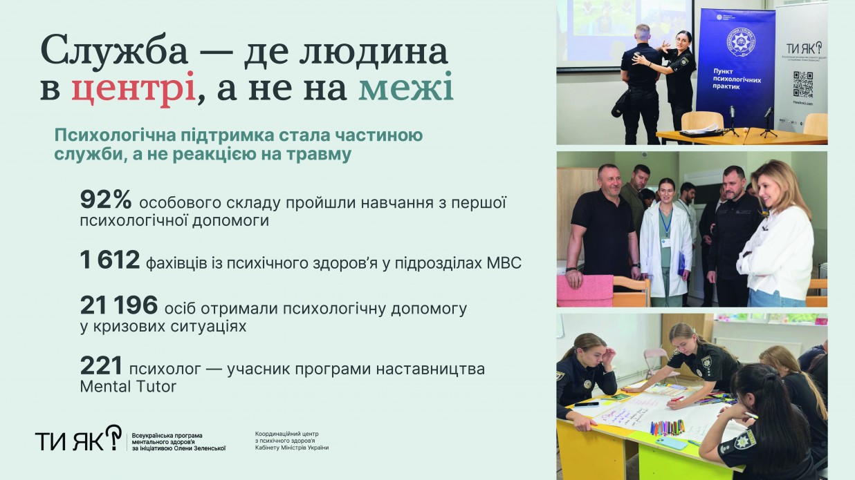 Ninety-two percent of the personnel of the Ministry of Internal Affairs of Ukraine have completed training in first psychological aid. As a result, 21,200 affected Ukrainians have received support, including 2,500 employees of the State Emergency Service and the National Police. Within the Social-Legal Protection of Victims and Their Families functional subsystem, psychological assistance was provided to 1,000 victims and 235 of their relatives. Nearly 80,000 people participate in the Point of Psychological Practices educational project.