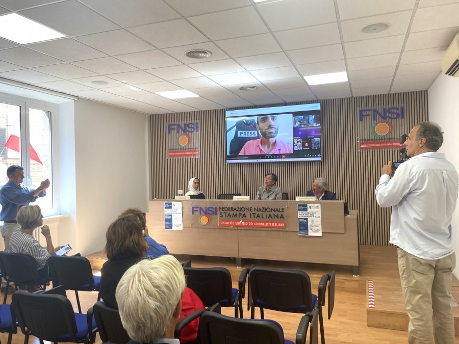 Rivendica il diritto all'informazione Aya Ashour. «Le difficoltà e le sofferenze che oggi a Gaza e in Cisgiordania i giornalisti affrontano nel diffondere le notizie sono enormi», testimonia. E Alhassan Selmi, collegato da Gaza, denuncia: «Noi giornalisti cerchiamo di fare il possibile, e non so chi sarà il prossimo a essere ucciso, perché qui i giornalisti sono un bersaglio», ma «io credo che il messaggio di pace non morirà, il messaggio di pace non può essere ucciso».