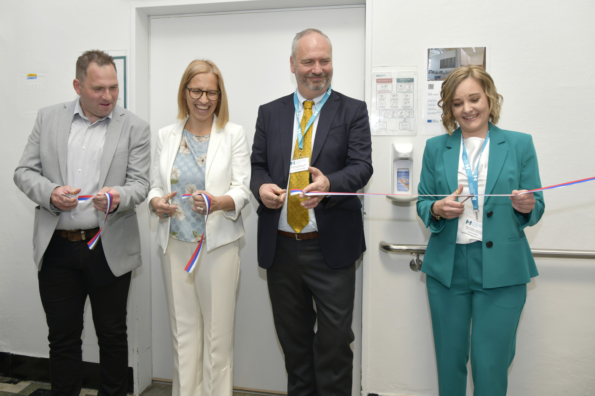 Ministrica za zdravje dr. Valentina Prevolnik Rupel, vršilec dolžnosti direktorja Dimitrij Klančič, vodja oddelka Silvan Saksida in predstojnica tehnično-oskrbovalne službe Natali Sardon Pahor, prerezali slavnostni trak ob odprtju dializnega centra. | Avtor: Foto atelje Pavšič Zavadlav