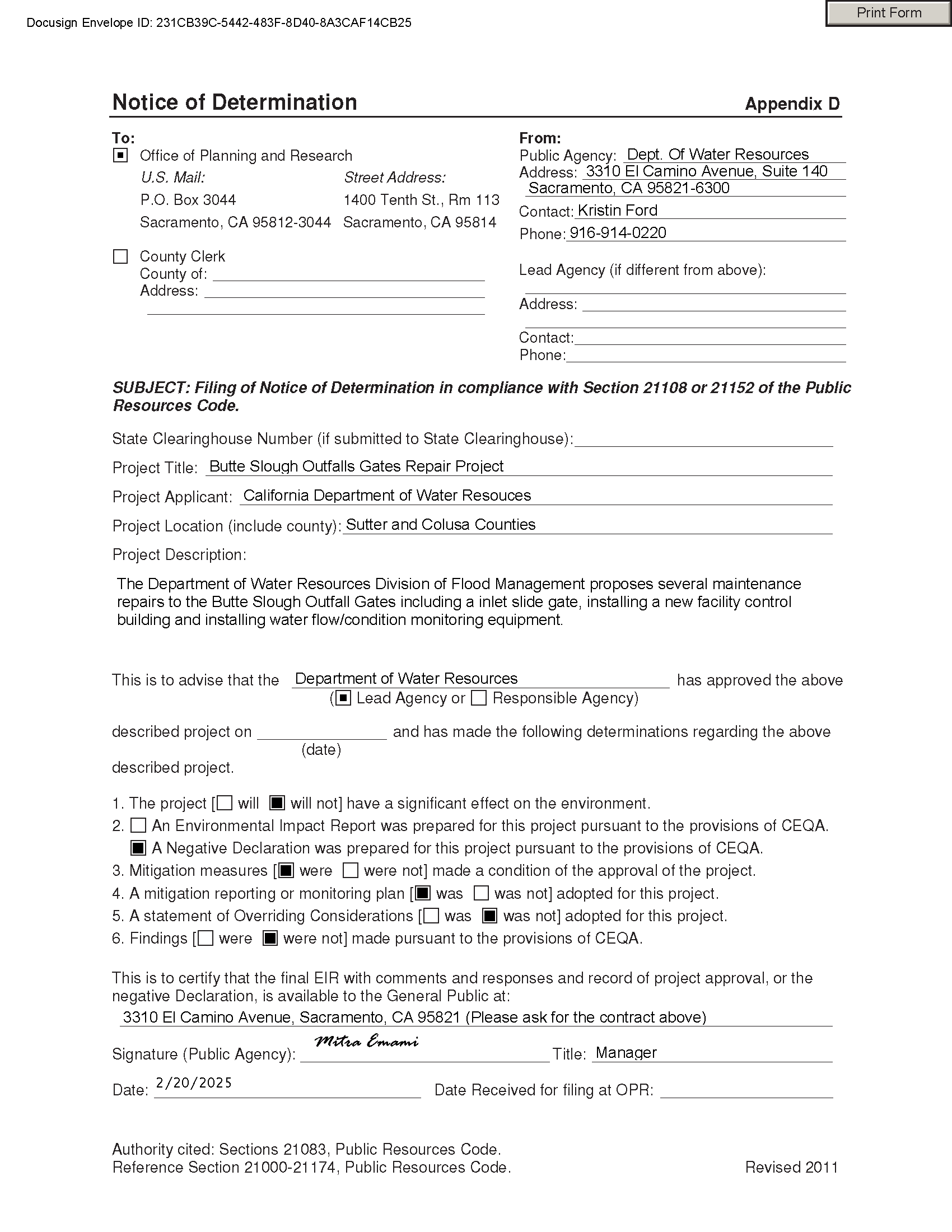 The Draft IS/MND was submitted to the State Clearinghouse ([SCH] No. 2024061069) for public review from June 25, 2024, to July 25, 2025. DWR received two comment letters, one from the California Department of Fish and Wildlife and one from the Regional Water Quality Control Board. DWR revised the IS/MND based on CDFW's comments. DWR adopted the IS/MND and the Mitigation Monitoring and Reporting Program (MMRP), approved the project, and executed the Notice of Determination (NOD) on February 21, 2025. DWR filed the NOD with the State Clearinghouse on February 21, 2025.