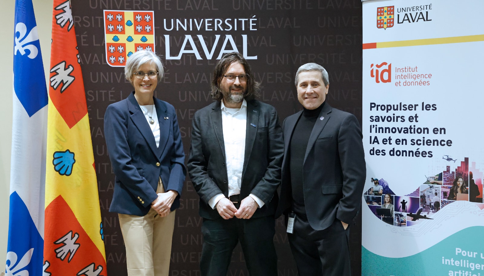 La rectrice Sophie D'Amours, Christian Gagné, directeur de l'IID et professeur au Département de génie électrique et de génie informatique, et Jean-François Simard, ministre des Ressources naturelles et des Forêts et ministre responsable de la région de la Capitale-Nationale, lors de l'annonce le 10 avril