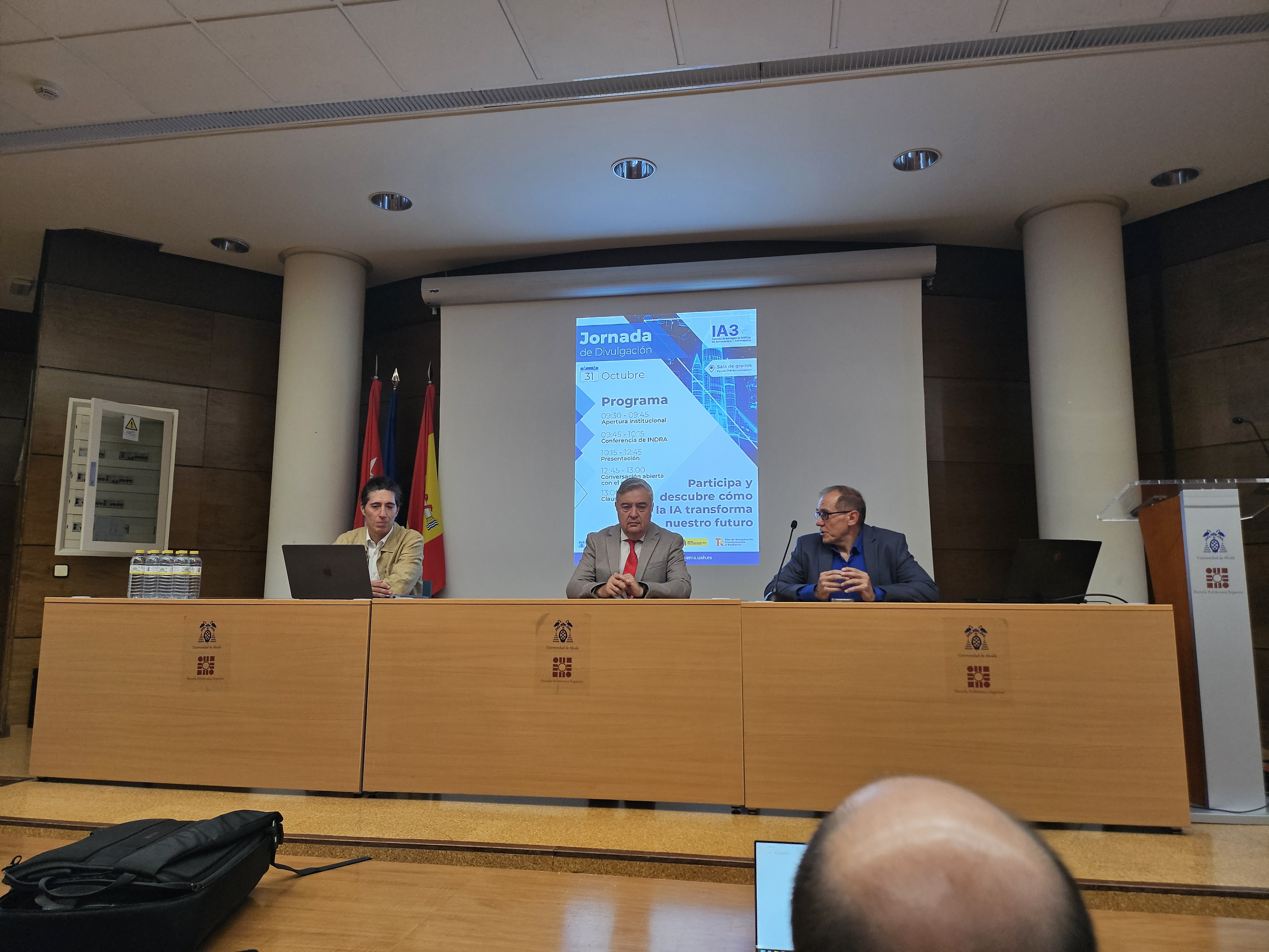 Al acto de la renovación de la cátedra han asistido, entre otros, Haizea Gómez, responsable del Laboratorio avanzado de R&T de IA/TI Aplicada del Centro de Innovación Tecnológica de Indra Group; el vicerrector de Investigación y Transferencia de la Universidad de Alcalá, Javier de la Mata; y el director de la Cátedra de Inteligencia Artificial en Aeronáutica y Aeroespacio, Agustín Martínez Hellín.