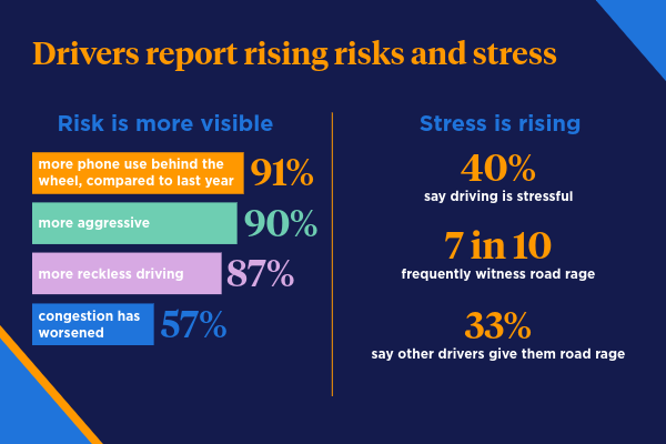 Nearly 9 in 10 drivers say phone use behind the wheel has increased in the past year, alongside similar spikes in aggressive and reckless driving. As a result, 40% say they experience stress while driving, and more than two-thirds frequently witness road rage.