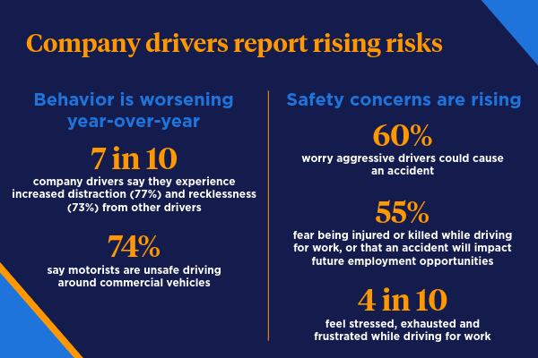 That behavior is making an already demanding job more stressful. Nearly half of commercial drivers (47%) say they feel stressed, exhausted and frustrated while driving for work, and 60% worry that aggressive drivers could cause an accident.