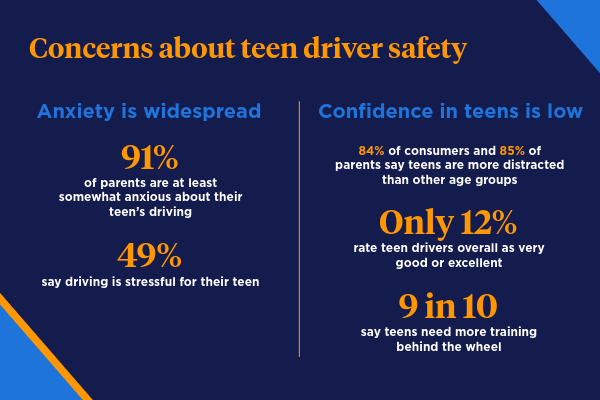 At the same time, confidence in young drivers remains low. More than 8 in 10 consumers (84%) and parents (85%) believe teens are more distracted than other age groups. Just 12% rate teen drivers as very good or excellent. Nearly nine in 10 also say teens need more behind-the-wheel training.
