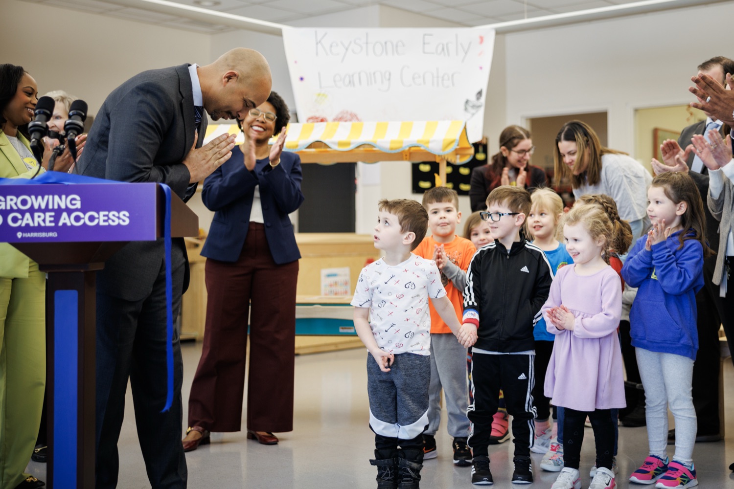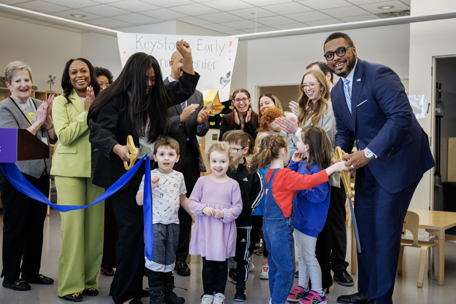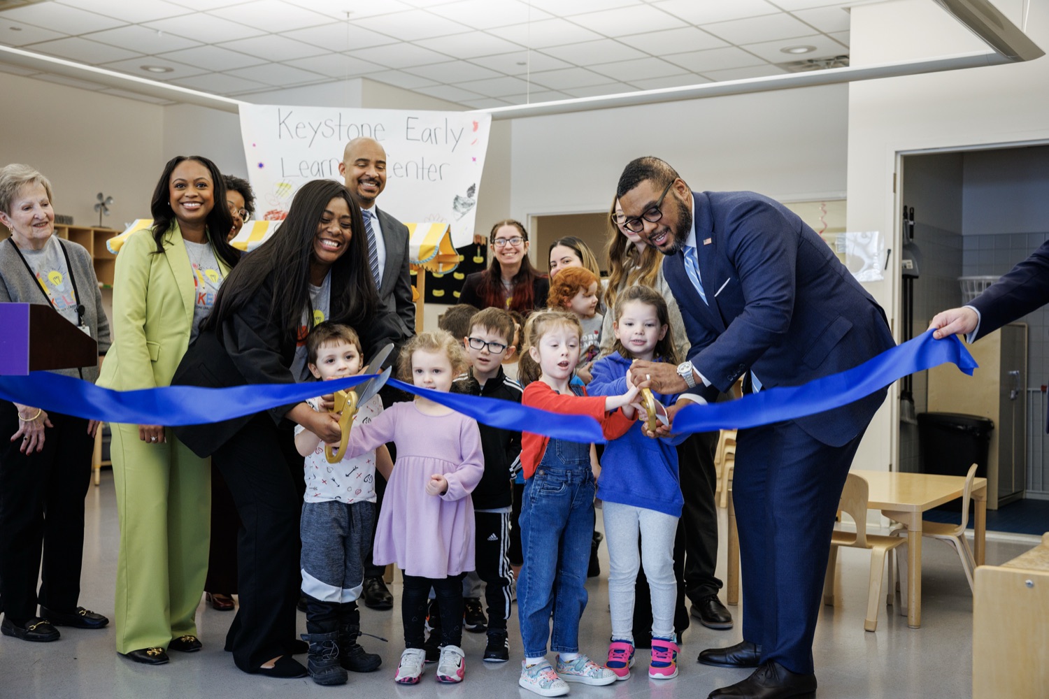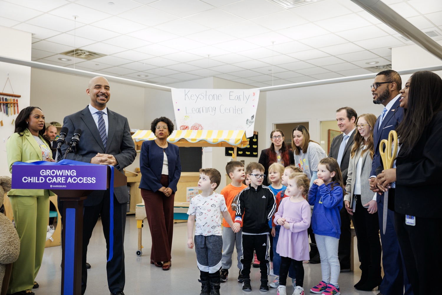 Lieutenant Governor Austin Davis, Secretary of Administration (OA) Neil Weaver, Department of General Services (DGS) Secretary Reggie McNeil, andPublic Utility Commission (PUC) Vice Chair Kimberly Barrowjoined child care staff, teachers, and parents at the Keystone Early Learning Center (KELC)to celebrate the opening and ribbon-cutting ofan expanded new facilitythat increases access to on-site child care for Commonwealth employees working in the Capitol Complex.The expansion will significantly increase capacity, adding space for 68 additional kids and bringing the total that can be served at the KELC to 162.