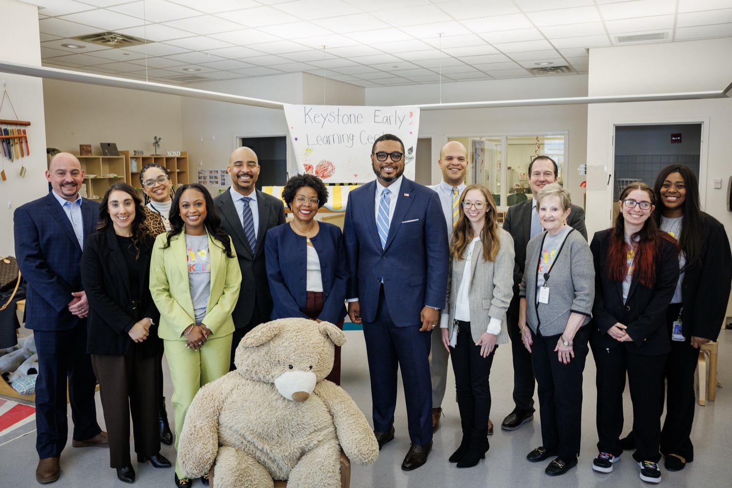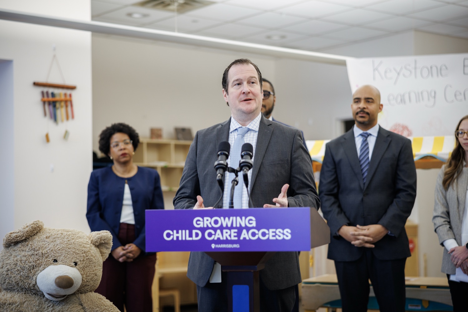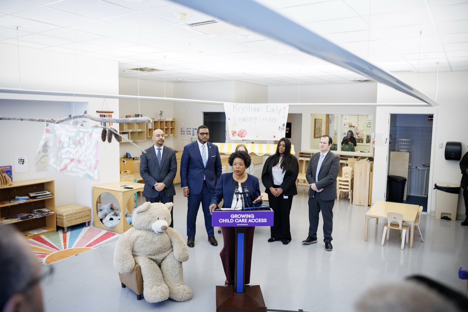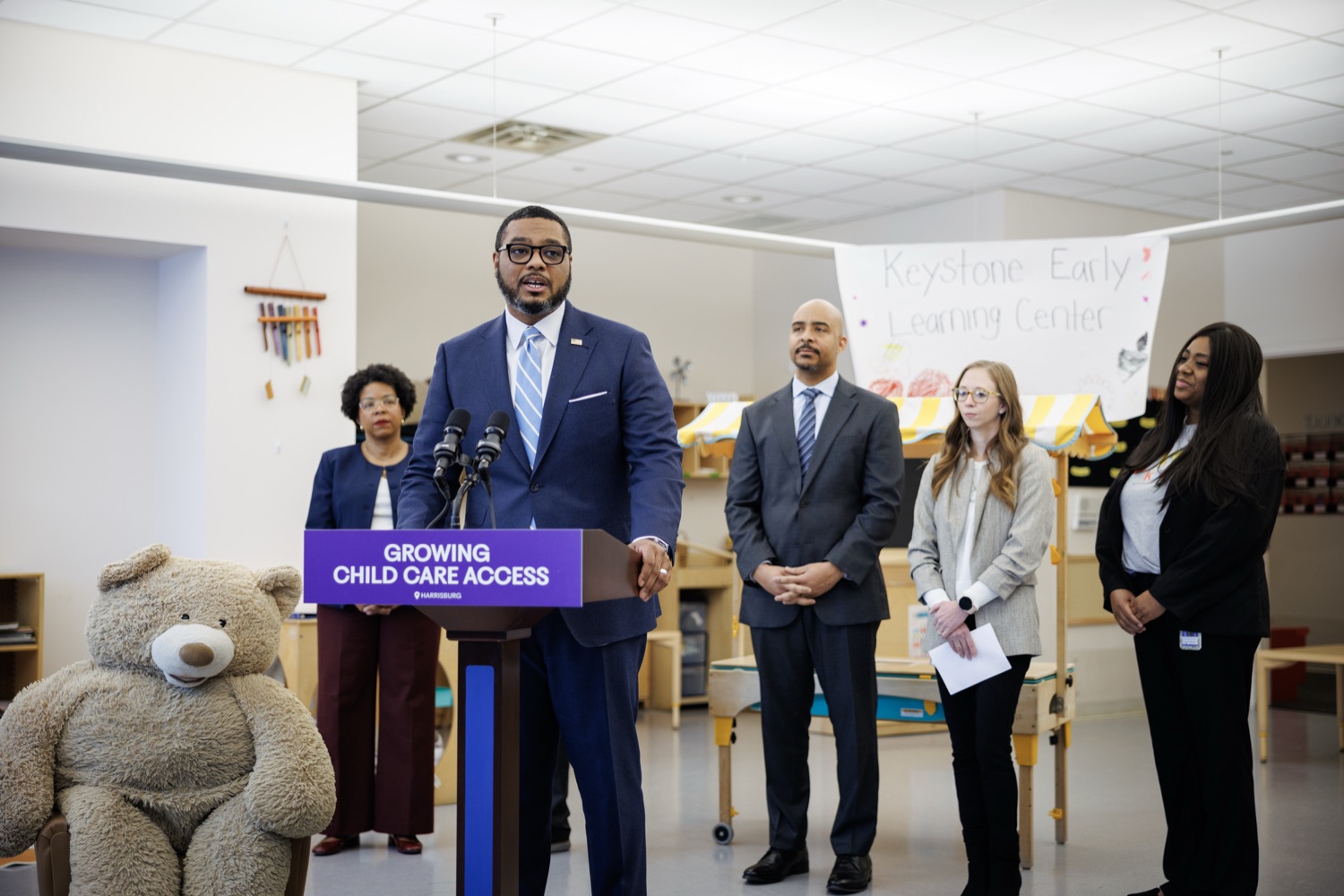 Lieutenant Governor Austin Davis, Secretary of Administration (OA) Neil Weaver, Department of General Services (DGS) Secretary Reggie McNeil, andPublic Utility Commission (PUC) Vice Chair Kimberly Barrowjoined child care staff, teachers, and parents at the Keystone Early Learning Center (KELC)to celebrate the opening and ribbon-cutting ofan expanded new facilitythat increases access to on-site child care for Commonwealth employees working in the Capitol Complex.The expansion will significantly increase capacity, adding space for 68 additional kids and bringing the total that can be served at the KELC to 162.