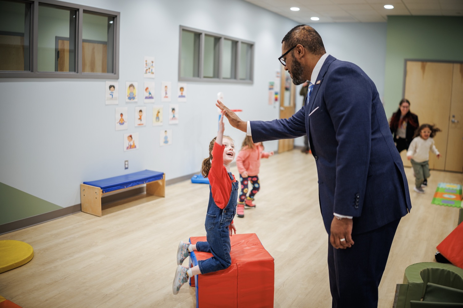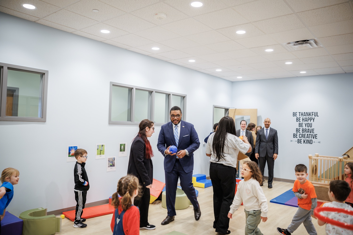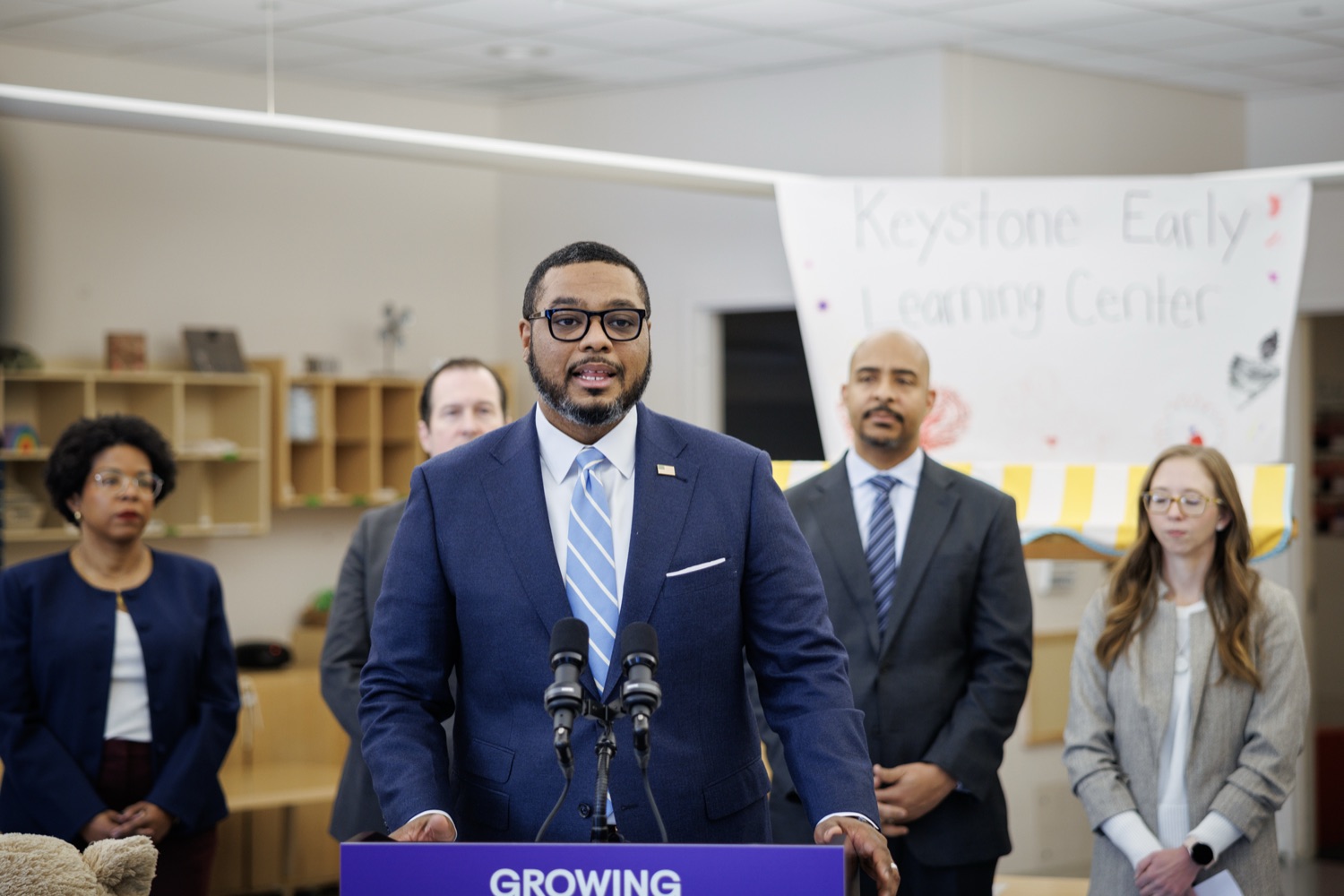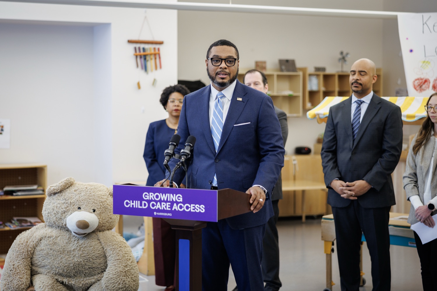 Lieutenant Governor Austin Davis, Secretary of Administration (OA) Neil Weaver, Department of General Services (DGS) Secretary Reggie McNeil, andPublic Utility Commission (PUC) Vice Chair Kimberly Barrowjoined child care staff, teachers, and parents at the Keystone Early Learning Center (KELC)to celebrate the opening and ribbon-cutting ofan expanded new facilitythat increases access to on-site child care for Commonwealth employees working in the Capitol Complex.The expansion will significantly increase capacity, adding space for 68 additional kids and bringing the total that can be served at the KELC to 162.