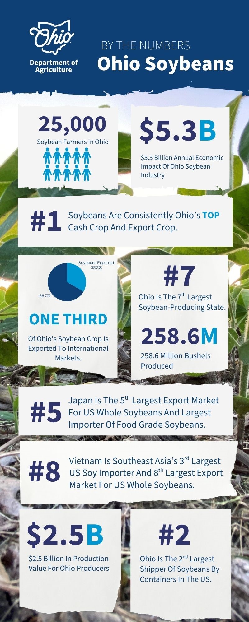 Ohio ranks seventh nationally in soybean production, producing about 258 million bushels in 2025. Approximately one-third of all soybeans produced in Ohio are exported to international markets, making it the state's top agricultural export. Japan and Vietnam were priority markets for this mission based on strong existing relationships and demand for high-quality U.S. soybeans.